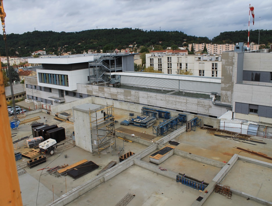 Murs grande hauteur 13 ml (1 seule levée en béton auto plaçant), dalle grande portée 10 ml et grande hauteur 8 ml sur les réserves et voiles droites grandes hauteur.